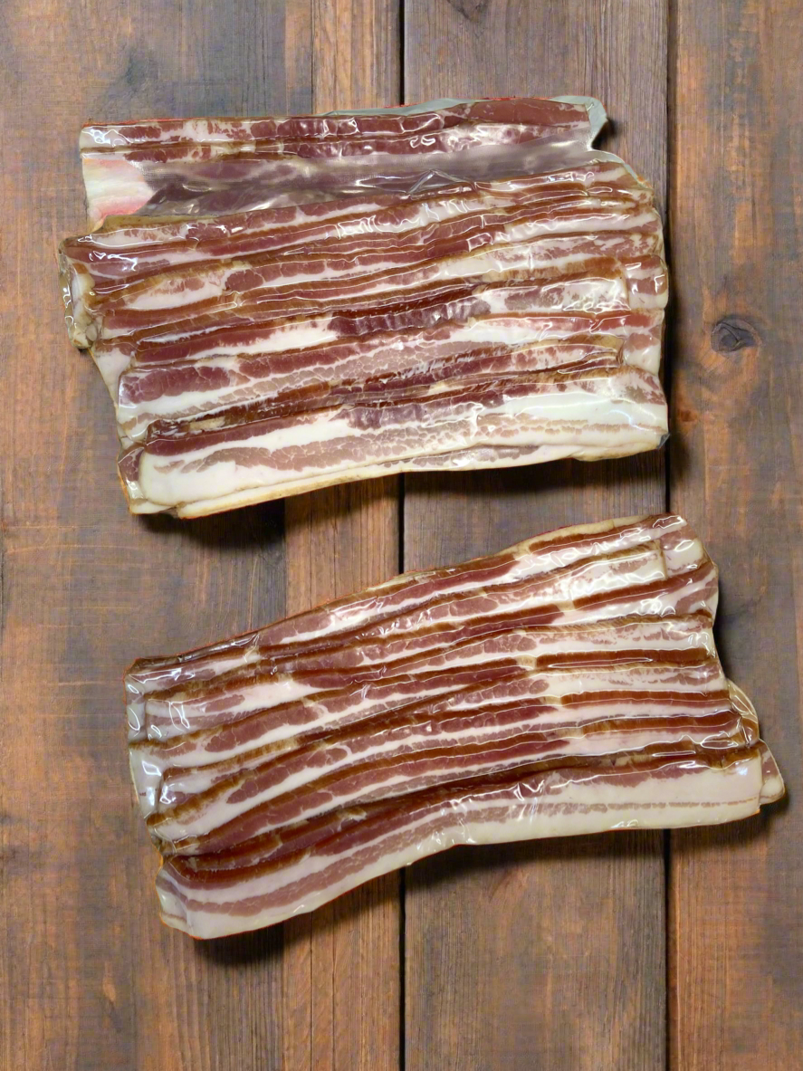 Bacon made the old way, by hand rubbing, hickory smoking and cured our special way! Since no water is added in curing, dry cured bacon doesn't shrink in cooking like store-bought bacon does. So you get more for your money. A superb bacon you must try!
